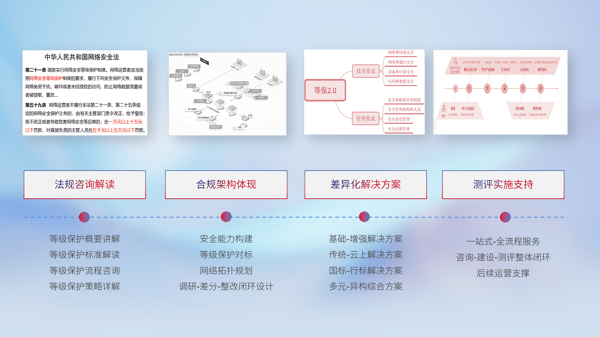 通过专业的法律咨询解读、、、合规架构体现、、、差异化解决方案、、测试实施支持等服务,,,为客户量身打造等保合规体系。。