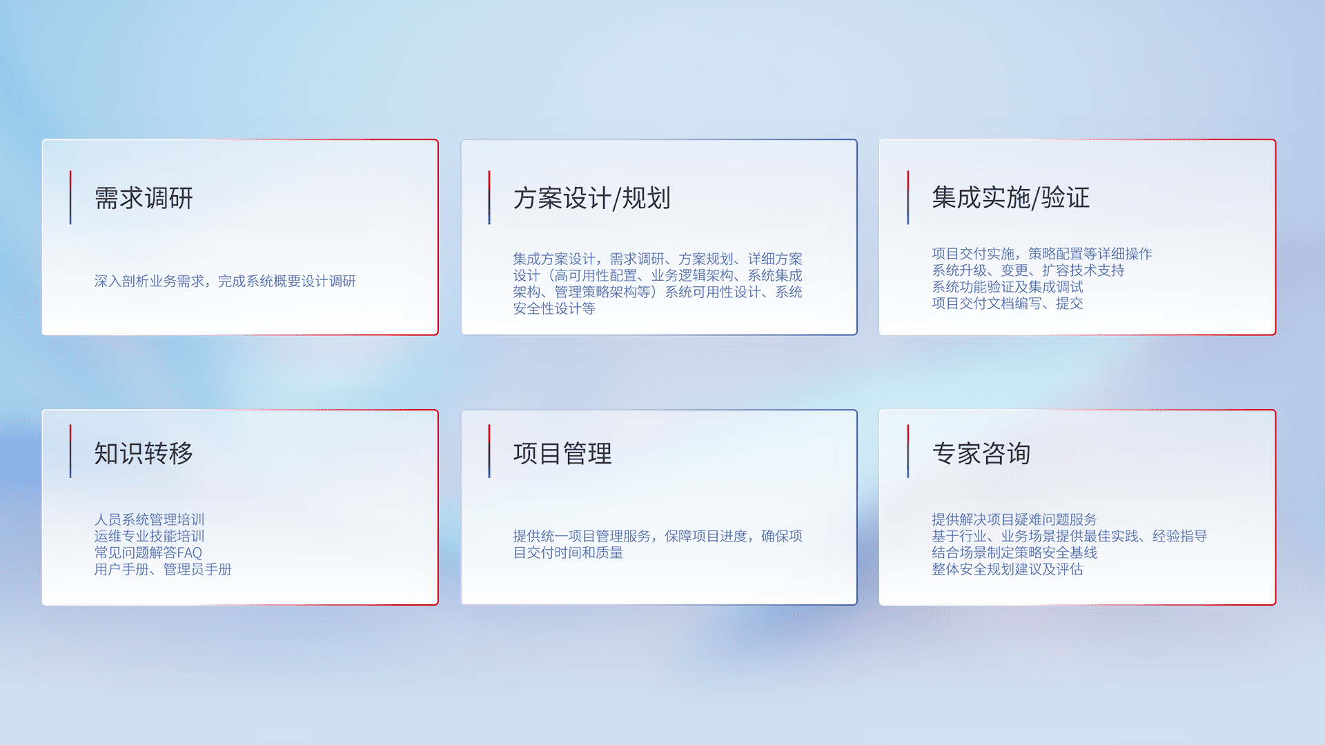 针对客户行业特性,,,将宏观的安全战略和需求,,,通过专业的交付服务,,,实现项目落地,,为客户提供标准规范的集成交付服务。。。